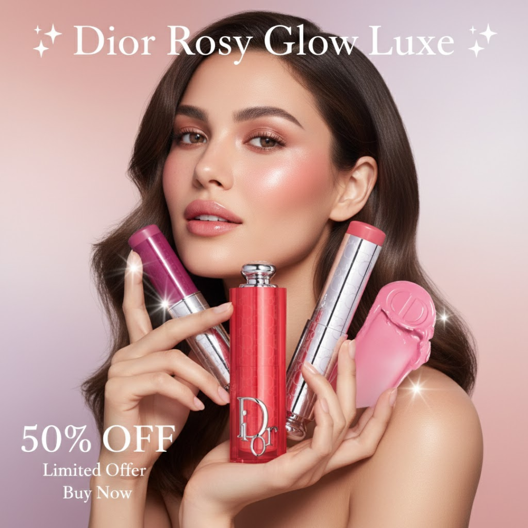 Experience a lit-from-within radiance with the Dior Rosy Glow Luxe Collection, featuring pH-activated color sticks that adapt to your skin’s chemistry for a truly personalized flush. This luxurious, multi-use balm delivers a dewy, natural glow with 12-hour wear and all-day hydration, perfect for cheeks, lips, and eyes. Now available in exclusive sets with up to 50% OFF for a limited time.