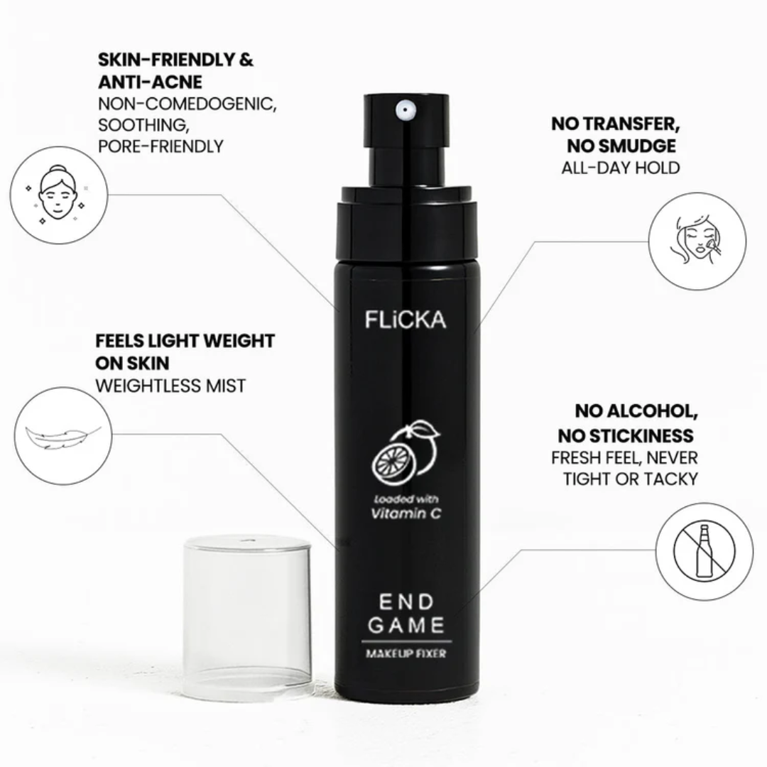 ✅ End Game Makeup Fixer – A weightless mist that locks makeup in place for 12 hours, prevents transfer, and gives a fresh, non-sticky finish. Enriched with Vitamin C for a brightening boost.